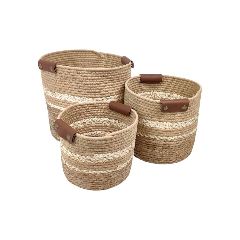 Корзина-кашпо круглая, набор из 3 шт, водоросли/текстиль, натуральный/молочный, FA35-37