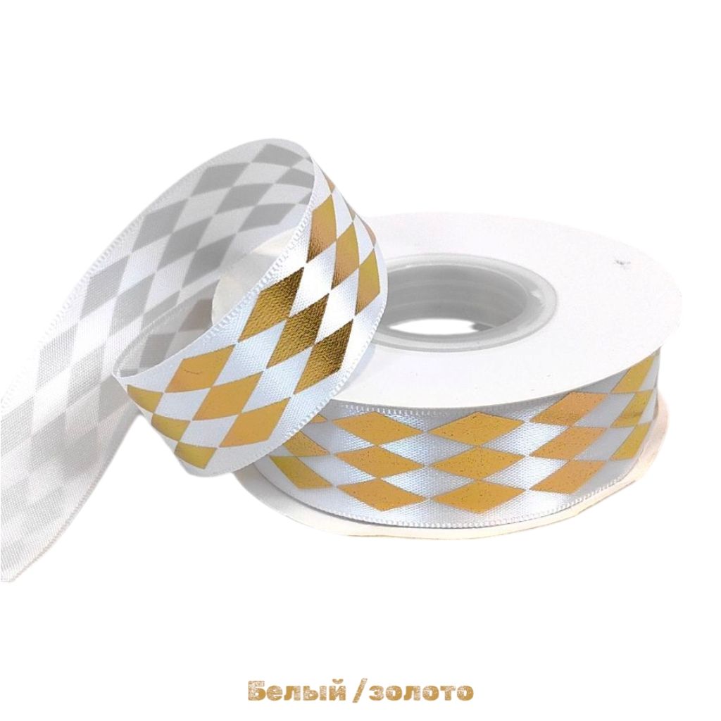 Лента атласная Арлекин 2.5 см х 25 ярдов, P87-14 (белый/золото), описание, фото о товаре.